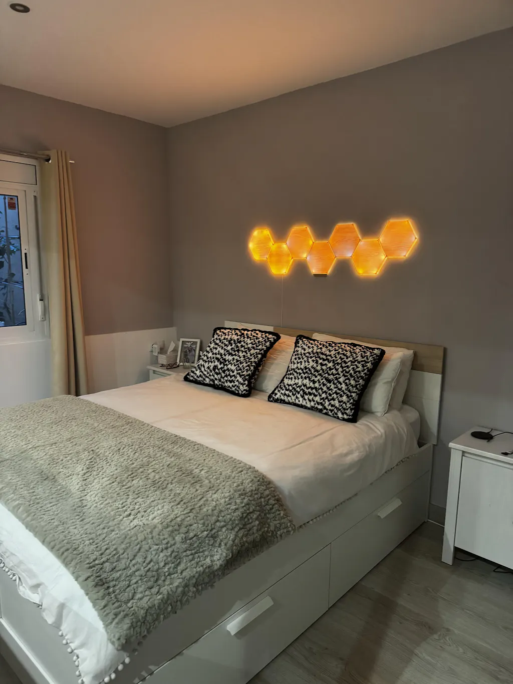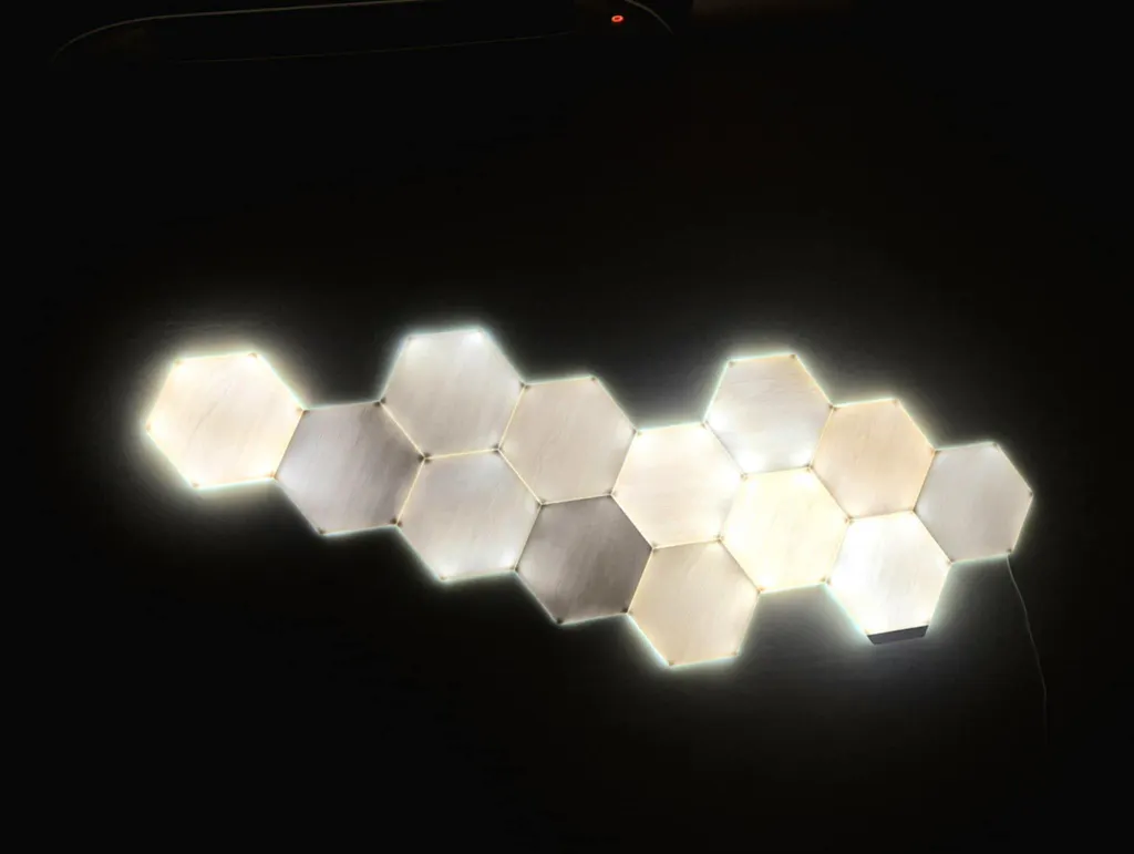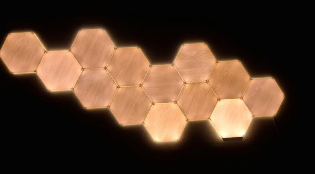 Nanoleaf Elements Hexagons Starter Kit come with everything you need to create your own unique lighting designs. Enjoy the sophisticated wood grain veneer while off, or turn them on to illuminate your space with a dynamic glow. Install in your living room, bedroom, entryway, or any space where you want to add an elegant and organic feel to your home. Install on any flat surface with included adhesive Mounting Tape; no additional tools required. Compatible with all Connect+ products like Shapes Triangles, Hexagons, and Mini Triangles.